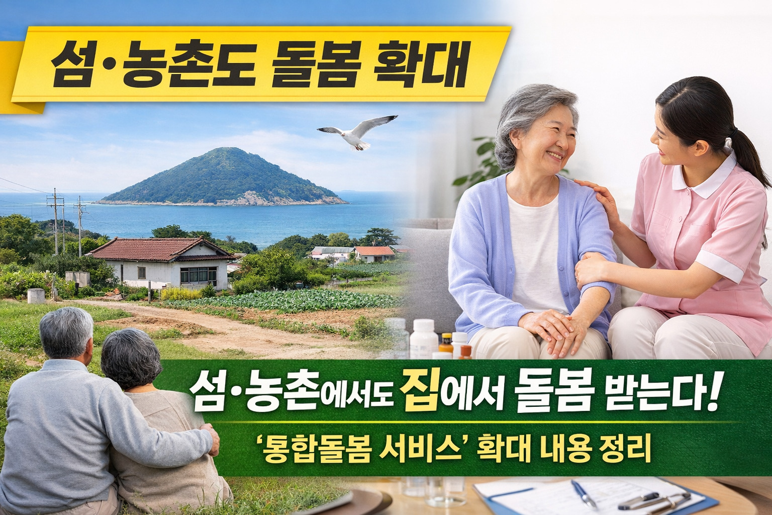 이런 문제를 해결하기 위해 정부가 추진하고 있는 정책이 바로 ‘통합 돌봄 서비스’입니다. 그리고 이제 이 서비스가 도시뿐 아니라 도서·벽지 지역까지 확대될 예정입니다.