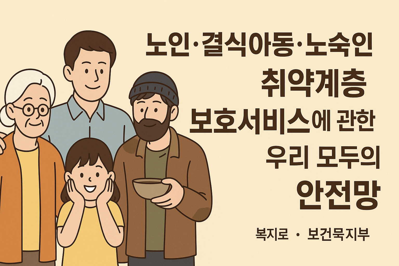 우리는 누구나 살아가면서 예상치 못한 어려움을 맞이할 수 있습니다. 나이가 들어 홀로 남게 되거나, 어린 나이에 끼니를 거를 수밖에 없는 환경에 처하거나, 주거지를 잃고 거리에서 밤을 보내야 하는 순간이 올 수도 있습니다. 이런 상황에 놓인 분들을 돕는 것이 바로 사회적 안전망이고, 취약계층 보호서비스가 그 역할을 하고 있습니다.